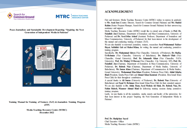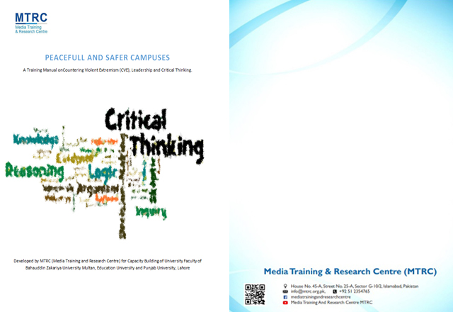 This manual is redesigned specifically for training faculty of universities in South Punjab and Punjab Universityon countering violent extremism, critical thinking, and leadership.MTRC has taken up the initiative to build the capacities of universities on modules of Critical Thinking and Countering Violent Extremism.